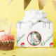 A Adorável Saanen com seu Pai Natal e no círculo vermelho está uma cabra bebê descobrindo os ornamentos na árvore - cabras decoram o papel de embrulho de Natal deste legal amante de cabras. Feliz Natal escrito em texto verde - você pode personalizar o texto se quiser