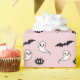 Um bebê bonito, rosa e preto, embrulhando papel com o tema do Dia das Bruxas com um fantasma giro, morcegos pretos e texto BOO. Dê a alguém um presente de Halloween ou aniversário com uma pop de cor bonita e inesperada.