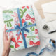 O arco de Natal de moda embrulhando papel em cores verde, vermelho, azul e rosa.