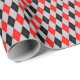 Um papel de embrulho projetado com um padrão vermelho, preto e cinza argyle.