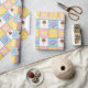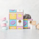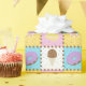 Satisfaça o seu doce dente com este padrão colorido que apresenta gostosões como um cone de sorvete de chocolate, uma rosquinha de chocolate fosco púrpura, um macarão amarelo-limão, e um pirulito rodoso, rosa e branco, separado por pedaços de chocolate e cercado por aspersão arco-íris em quatro quadrados brilhantemente abarrotados.