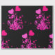 Belo papel de embrulho com um padrão cor-de-rosa de design de coração floral sobre fundo preto. Este belo papel de embrulho de flores seria excelente para aniversários, aniversário, chás de fraldas e muito mais.
