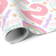O número 2 é o design de destaque neste papel de embalagem de segundo aniversário. Um arco-íris e as estrelas completam a cor púrpura, rosa, pêssego e azul para um aspecto festivo, mas doce.