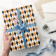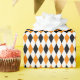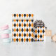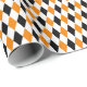 Um papel de embrulho projetado com um padrão de harlequin preto, laranja e branco. Personalize a cor branca de fundo entre outras opções.