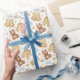 Enrole seus presentes de chá de fraldas com amor usando esse papel de embrulho de bô neutro em gênero. Apresentando ilustrações aquáticas de roupas acolhedoras para bebês, pacificadores, ursos peludos e estrelas ouro, este design macio e charmoso é perfeito para celebrações rústicas, florestais ou de temas neutros. Um toque doce e na moda para o final de qualquer presente de chá de fraldas.