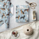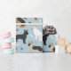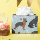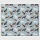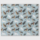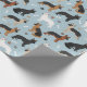 German shepherd bonitos em preto e bronzeado, preto e vermelho, preto e vermelho, preto e prateado, casacos brancas e traseiras, sentados e em pé com ossos de cão espalhados e pegadas em um fundo azul claro.