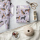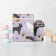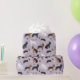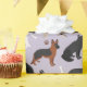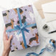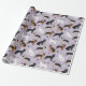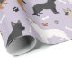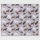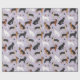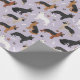 German shepherd bonitos em preto e bronzeado, preto e vermelho, preto e prateado, casacos brancas e traseiras em preto e branco e em pé com ossos de cão espalhados e pegadas em um fundo roxo claro.