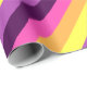 Um rolo de papel de embrulho que apresenta um design de padrão bonito e colorido de faixas diagonais em púrpura, lavanda, amarelo-limão, laranja-melão e magenta brilhante.