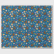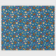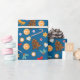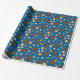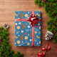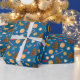 Papel de enrolar com um padrão de Ano Novo, fotos fofinhas de doces, lábios e biscoitos, arcos e folhas de pão de gengibre em fundo azul.