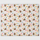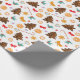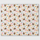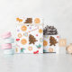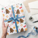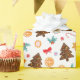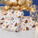 Papel de enrolar com um padrão de Ano Novo, fotos bonitinhas de doces, lábios e biscoitos de pão de gengibre, arcos e folhas.