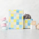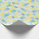 Um papel de envolvimento projetou com um teste padrão quadrado em tons azuis e amarelos.