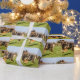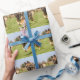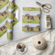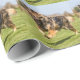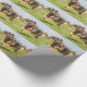 Papel de envolvimento que caracteriza um Alsatian do cão de german shepherd, é muito bonito, bonito, macio e peluches. É sable escuro um cão de cabelos compridos colorido. Está funcionando feliz e está saltando através do ar que persegue uma bola.