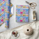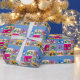 O papel de envolvimento perfeito para um presente para qualquer um que são no ciclismo e que gosta do design limpo, moderno. O design é um teste padrão das ilustrações clássicas da bicicleta inspiradas pelo artista Mondrian e por seu trabalho abstrato geométrico com blocos contínuos de cor dentro das rodas. As cores incluem o cinza azul, amarelo, roxo, verde, alaranjado e concreto. Grande papel de embrulho para os loucos de ciclagem. Você pode mudar a cor azul do fundo ao terno usando o botão da personalização.