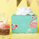 O design à moda com um toque retro que caracteriza os flamingos cor-de-rosa festivos que vestem os chapéus, estrelas vermelhas e as palmeiras do papai noel decorados com baubles ajustou-se contra um fundo do aqua. Um design customizável para que você personalize com seus próprios texto, imagens e ideias. Uma imagem digital original da arte criou pelo chique subtil.