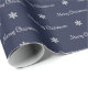Uma prata e um teste padrão azul do Feliz Natal com os flocos de neve no papel de envolvimento.