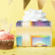 Um arco-íris vibrante no primeiro plano com um por do sol colorido no horizonte, cercado por uma beira do círculo colorido do pastel que quadro a foto. A parte dianteira do papel de envolvimento lê " em algum lugar."