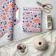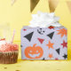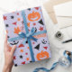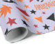 "Papel de Acondicionamento do Halloween: Abóbora, Folhas, Estrelas" combina abóboras brilhantes, folhas coloridas de outono e estrelas cintilantes, com palavras festivas de Halloween espalhadas por toda parte para um plástico de presentes.