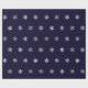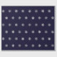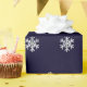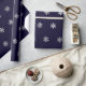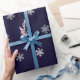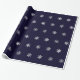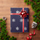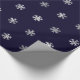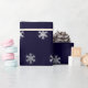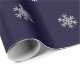 Papel de envolvimento do Natal com um teste padrão dos flocos de neve de prata do falso em um fundo azul escuro.