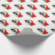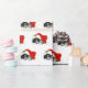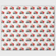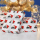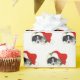 Este papel de papel de embrulho do Natal é mostrado com um fundo branco com um filhote de cachorro e um gatinho peluches bonitos snuggled junto em um chapéu vermelho grande do papai noel. Impresso all over.