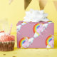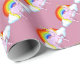 Papel de envolvimento cor-de-rosa com unicórnios cor-de-rosa em uma nuvem branca com um multi arco-íris da cor. A cor do papel pode ser personalizada.