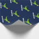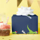 Papel de envolvimento bonito do Natal do dinossauro para miúdos. Dinossauro verde do rex de t com o giftwrap do chapéu do papai noel personalizado com nome dos childs. O design pré-histórico engraçado do papel de embrulho do dinasaur para o feriado dos rapazes pequenos apresenta. Faça um para o filho, neto, bebê novo, neto. Ilustração animal dos desenhos animados do t-rex pre histórico selvagem para crianças. Rex do tiranossauro de Papai Noel do divertimento. Azul feito sob encomenda do IE do fundo da cor.