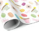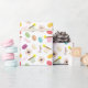 Papel de envolvimento que caracteriza um teste padrão temático da comida francesa dos macarons, dos teacups, das flores da anêmona, e do "Bonjour!"