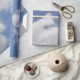 Este papel de envolvimento caracteriza nuvens macias brancas billowy em um céu azul bonito. Faz um grande papel de quadro de mensagens.