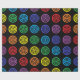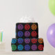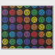 As bolinhas coloridas arco-íris com círculos pretos dentro deles dão o olhar de um design do bullseye contra um fundo preto.