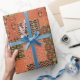 Um rolo do papel de envolvimento chique, com uns retalhos na moda do falso de padrões egípcios tradicionais no vermelho oxidado, no amarelo dourado, no verde e no preto. A parte da coleção "egípcia" fino e Painterly, este teste padrão pode facilmente ser adaptada para caber todo o rolo do papel de papel de embrulho.