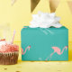 Papel de envolvimento tropical do Natal do flamingo cor-de-rosa com cumprimentos personalizados do nome e das estações. Design bonito do giftwrap do xmas com o pássaro tropical que veste um chapéu de Papai Noel. Feriado engraçado que envolve fontes para mulheres e miúdos dos homens. Feliz Natal! Azul de turquesa ou cor do fundo do costume. Disponível em matte e em lustroso.