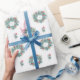 Papel de embrulho elegante, ilustrado à mão, que inclui as mariposas de renas e as madeiras de Natal com bagas, folhas e folhagem de eucalipto.