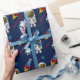 Papel de embrulho para o espaço bonito feito em azul escuro, com gráficos coloridos em estilo cartoon de uma nave espacial, robô, astronauta e planeta Terra ao fundo. Personalize o texto vermelho correndo diagonalmente para o aniversariante.