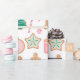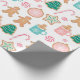 Este papel de embrulho apresenta um padrão de biscoitos decorados de pão de gengibre sobre um fundo branco brilhante.