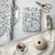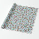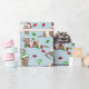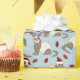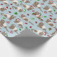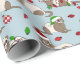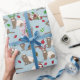 Furões de Natal bonitos em Santa Chapéu com canas doces e luzes de cordas sobre fundo azul com ornamentos espalhados embrulhando papel.