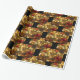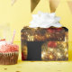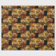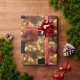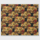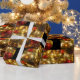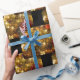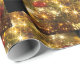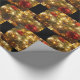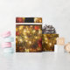 Papel brilhante de embrulho de Natal com bolhas de Natal vermelhas e ouros, luzes cintilantes, galhos de árvores de Natal e azulejo.