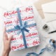 Este papel de embrulho de Natal apresenta uma adorável Design da Calliografia soletrando as palavras "Tenha um Feliz Natal". Ele também permite adicionar uma mensagem personalizada ou seu nome a ser impresso no papel. As cores dominantes deste design são vermelho, azul e branco.