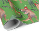 Estes dinossauros realistas estão vestidos com chapéus vermelhos de Papai Noel para ajudar a tornar a feliz das festas de dino e brilhante. Tyrannosaurus Rex, dinossauros voadores e um pescoço verde e longo. Fundo verde.