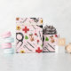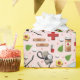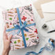 Embalagem de presente com temática médica exclusiva com material de saúde e padrão de flores em fundo rosa.
