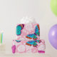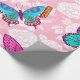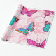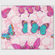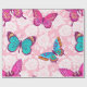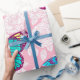 Padrão perfeito com borboletas coloridas e rosas em fundo rosa, ilustração vetorial. As borboletas são cor-de-rosa, azuis e turquesa. As rosas são brancas. O estilo é cartoonista.