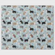 Pastores australianos lindos / Cães australianos em casacos pretos, marrons e de funil sentam-se e mantêm ossos de cães espalhados e estampas de pata em um fundo azul claro.