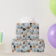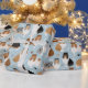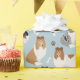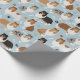 Cães de Collie Rough Cute sentam-se e ficam de pé e rollover com casacos sápidos, tricolores, unidos e brancos com ossos de cão espalhados e padrões de pegadas.