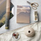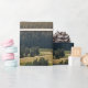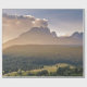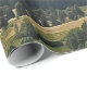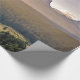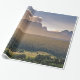 Este papel de embrulho apresenta uma bela paisagem pintada com montanhas sobre um vale de madeira.