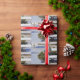 Uma fotografia de uma coroa de Natal, neve e uma cerca branca. Isso é brilhante e colorido. Isso está no papel de embrulho. Isso foi em Hutchinson Kansas EUA.