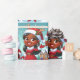 Um papel de embrulho festivo com uma pele castanha alegre e alegre, o Sr. Claus, no seu terno vermelho clássico, e a Sra. Claus num vestido de férias, ambos acenando com alegria. O fundo mostra uma cena de uma vila nevada com renas brincalhonas, criando uma atmosfera feliz. O design capta a essência da alegria de Natal, fazer-a perfeita para embrulhar presentes de Natal especiais.