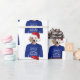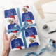 Cachorro de recuperação de ouros com suéter feio de Natal azul e chapéu de Papai Noel em fundo branco. A cor de fundo pode ser alterada.