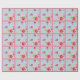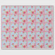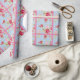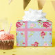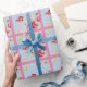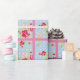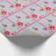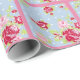 Um papel de embrulho bonito com rosas em azul com bolinhas brancas e um fundo cor-de-rosa correspondente.