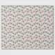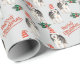 Um lindo Cachorro Siberiano veste um chapéu de Papai Noel listrado vermelho e branco no padrão deste papel de embrulho de Natal. Junto com as imagens do cão, estão borras verdes e sprigs com bagas vermelhas, e texto vermelho que diz "Feliz Natal". As imagens e o texto são colocados sobre um fundo de cinza prateada.