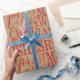 Este papel de embrulho de Natal tem design de tipografia de 'Desejos Quentes para um Feliz Natal' num padrão de offset vermelho sobre um fundo de papel Kraft. Procure para ver mais desse conjunto de design de correspondência moderno e misturado usando ID589.