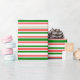 Este design de papel de embrulho apresenta um padrão listrado inspirado no Natal com cores como vermelho, branco e verde. Um papel de embrulho como este pode ser usado na preparação de presentes ou presentes para comemorar um aniversário, um casamento, um aniversário ou qualquer outro evento.