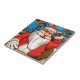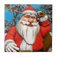 Renderização digital 3D de um Papai noel andando e carregando um saco com presentes numa floresta de inverno, efeito de pintura